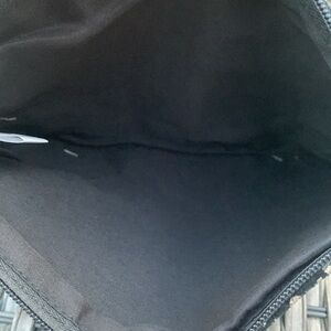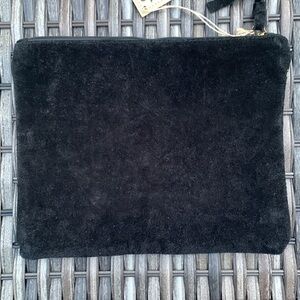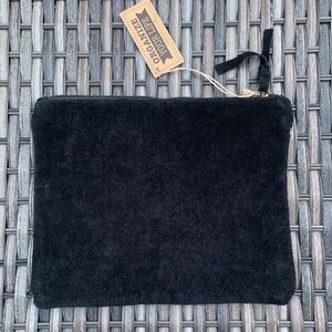 Soft and supple black suede pouch in a larger size is perfect for carrying all of your essentials when on the go. Stylish gold foiled print on front. Zip top closure.