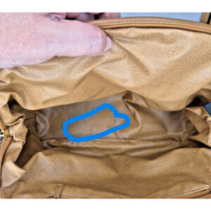 This is a pre-owned Carryland tan faux ostrich leather satchel handbag. It features a structured design with double-rolled handles, gold-tone hardware, and a decorative twist-lock front detail. Roomy and stylish—great for everyday use or business casual looks.