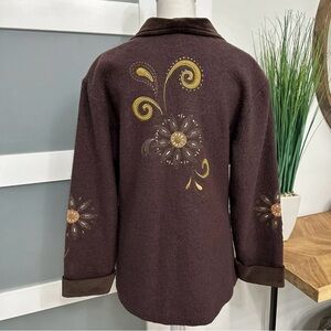 Carson Vintage Boiled Wool Jacket Velvet Collar SZ L Brown Artsy Embroidered EUC