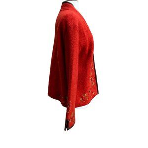 This vibrant red cardigan by Carson features intricate embroidery, adding a touch of elegance. Made from 100% wool, it offers warmth and comfort.
