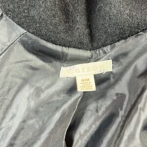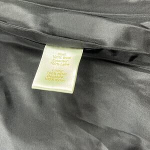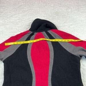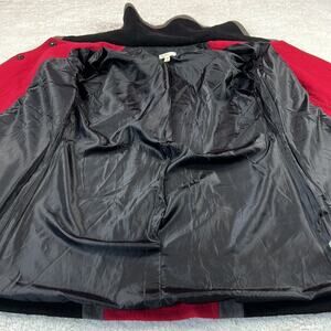 Felted wool coat featuring a flattering curved abstract design in red, grey, and black. Oversized decorative black buttons march down the front, with snap closures hidden beneath. Coat is lined, with slit pockets at hips. No stretch in this beauty, but I felt the sizing ran larger than medium