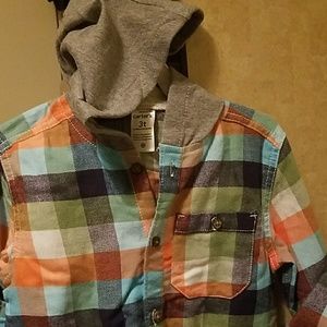 New Carter's. .. shirt has orange,dark blue, light blue, and white colors. Pants are dark blue