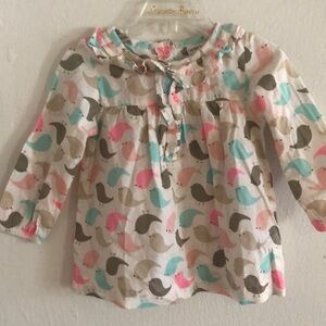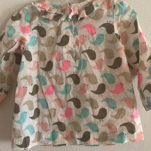 Adorable blouse with colorful bird pattern. Features long sleeves and a ruffled neckline. Perfect for casual wear
