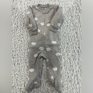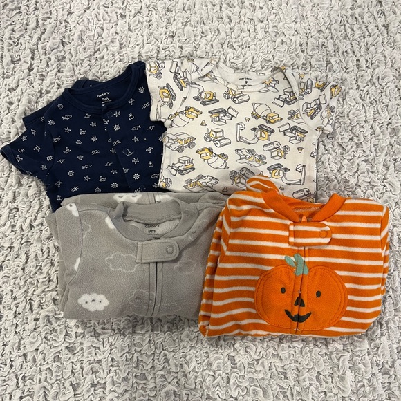Navy romper, construction onesie, gray with clouds fleece zip, & Halloween zip. Washed on cool & dried on cool, typical wear.
