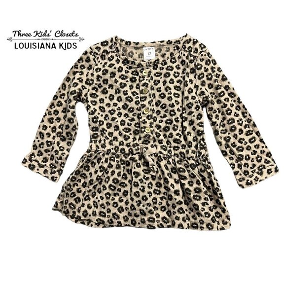 This adorable top features, a leopard animal print material and a long sleeve tunic style blouse. It is cinched at the waist band with a Peplum style hemline. It has cute gold button, detail up the front and on the sleeve cuffs. VGUC Size 12m