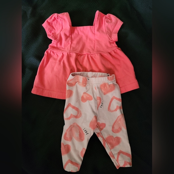 2 pc set by Carter's. So darling- a square neckline on this shirt sleeved top. Hearts and the word "love" on the stretchy buttons.