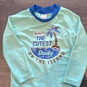 New without tags, never worn baby swim set from Carter’s, size 24 month. Blue and aqua rashguard swim shirt and blue swim trunks/board shorts with a palm tree pattern. Shirt has palm graphic as well carrying through the beach and tropical theme of this two piece set. Shorts are not lined for easy on and off. Drawstring in coordinating aqua color is functioning and waistband is elastic.