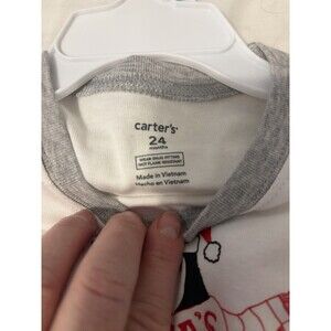 The Carter's 24M Pajama Set featuring a Penguin design as "Santa's Helper" is a festive and cozy choice for your little one during the winter holidays. Made from 100% cotton, this two-piece set includes a pullover top and matching bottoms in white, red, and black colors, perfect for Christmas-themed sleepwear. Easy to care for with machine washable instructions.