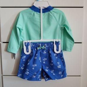 He's beach-ready in this 2-piece set, featuring a long-sleeve rashguard and matching tropical swim trunks!