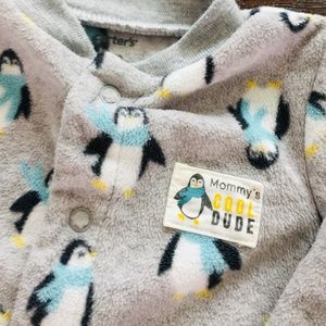 Gray footie with penguin & "mommy's little dude" detail on chest.