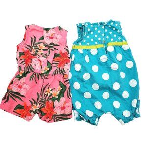 This two-piece romper set is a warm-weather dream for playful days and picture-perfect moments. The tropical pink romper brings a splash of vacation vibes with its vivid floral print, sleeveless cut, and sweet lace panel at the chest. Its elastic waist and snap hem design offer a secure and comfy fit. The second features a cheerful teal base with bold white polka-dots, finished with a sunny yellow bow detail and a blousy bubble silhouette. Both styles are soft, breathable, and designed for all-day movement and summer charm.