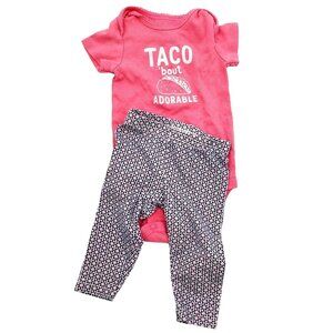 Sweet with a sense of humor, this playful two-piece set brings comfort and smiles in one adorable look. The neon pink short sleeve bodysuit features a cheeky "TACO 'bout ADORABLE" graphic with a taco print that adds a pop of fun to your little one’s wardrobe. Made from soft cotton, the bodysuit includes a convenient snap bottom for easy diaper changes. The outfit pairs perfectly with lightweight stretch leggings designed in an allover petite geo pattern with hints of neon pink, teal, and black. Cozy enough for cooler days and cute enough for photos, this look is equal parts practical and charming. Whether lounging at home or out on errands, it’s sure to get compliments everywhere you go.