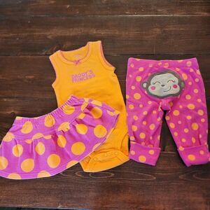 Carters 3 piece infant girls set includes sleeveless onesie and coordinating skirt and pull on pants... all size 3 months