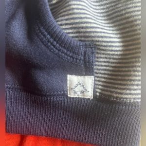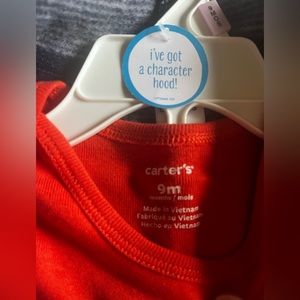 Adorable Carter’s 3-piece set for size 9 months. Fleece lined hoodie with dinosaur spikes, short sleeve pumpkin colored onesie, grey sweatpants.