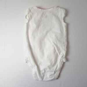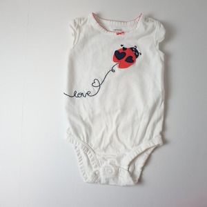 1. 100% Cotton sleeveless bodysuit with ladybug graphic in front and bow accent at neck