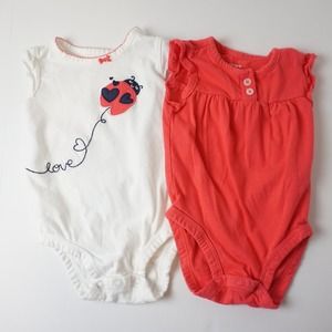This is an adorable 4-piece cotton set by Carter's with a red ladybug theme. Set includes two sleeveless ruffle bodysuits and two pairs of leggings.