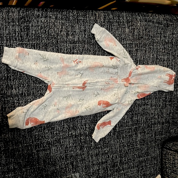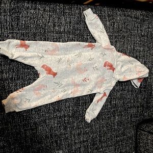 One piece pajama with forest animals all over. Worn once like brand new. Silver with pink and brown foxes.