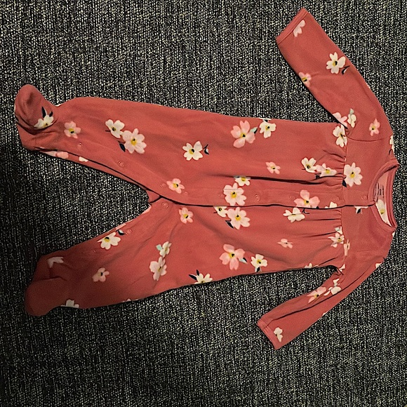 Carters one piece footsie button up. Maroon with pink and white flowers all over. Worn once like brand new:)