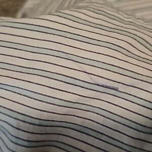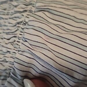 carters size 5 romper. white with light blue and navy pinstripe. two small stains shown in pics. worn a few times. otherwise good condition.
