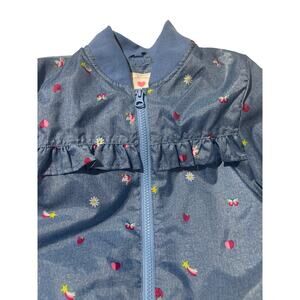 Carter’s 7 blue denim look windbreaker ruffed printed hearts rainbow daisies unicorn lightweight lined 100 polyester pockets full front zip nwt and perfect for school park play weekend activities new with tags contemporary clean beauty farmhouse denim look