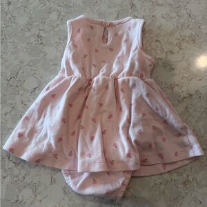 This charming pink diaper cover dress features a delicate trim, offering a sweet and stylish touch to any outfit. Perfect for adding a pop of color and comfort to your little one's wardrobe.