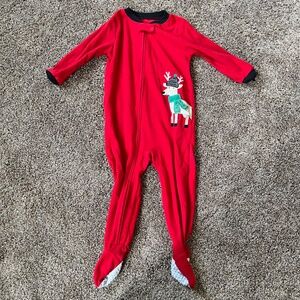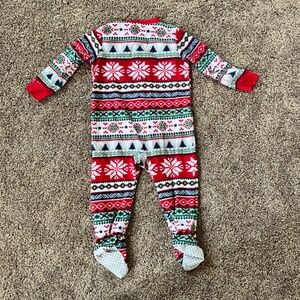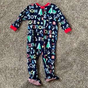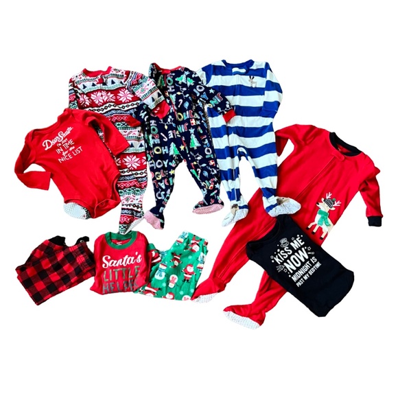 * Details: 9-piece bundle, with a holiday / Christmas / winter theme. Includes four pairs of holiday fleece footed pajamas with zippers; a two-piece holiday / Christmas pajama set (fleece bottoms, cotton top); a Santa themed onesie; buffalo plaid pants; and a New Year's Eve themed onesie.
