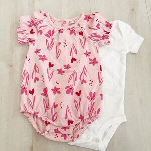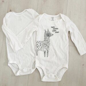 10 Onesies- 2 Long sleeve size 18 months (One Llama and one plain), 2 short sleeve onesies in size 9 months (One pink puffed sleeve and one plain white), and 6 short sleeve onesies in size 12 months (One plain white, two pink patterns, one purple pattern, one green pattern and one gray and white. pattern) See photos. Only one was worn and washed- purple.