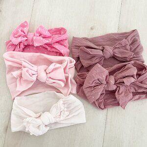 5 Headbands (Two mauve, one pink with dots, one light pink and one pale pink) Brand has a letter b on it- Baby Bling. Never worn.