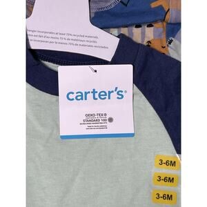 Get ready to dress your little one in style with this adorable two-piece set from Carter's. The set includes a green onesie with blue accents and cute animal designs, perfect for any unisex baby or toddler. The material is soft and comfortable for your child's delicate skin, and the design is both fashionable and playful. This set is perfect for any occasion, whether it's a family gathering or just a day out with mom and dad.
