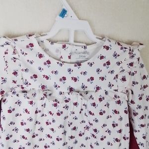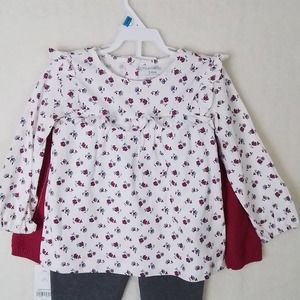 This set is adorable, cozy, and perfect for winter. It comes with a long sleeve top, leggings, and a matching cardigan. The cardigan is beautifully knitting. It is classic button front design with ribbed wrist/hem. The top is soft cotton. It features a scoop neck, ruffle shoulder/chest, and is gently gathered in front. The back of the top has 3 buttons. The leggings are also soft and stretchy. They have an elastic waistband and slim fit. This set is new with tags.