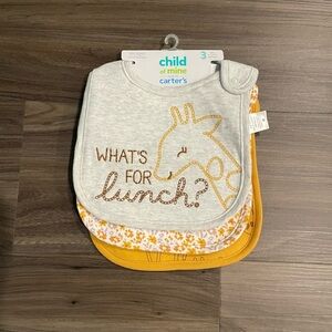 Adorable baby bib set by Carter's. Features a cute giraffe design. Perfect for mealtime.