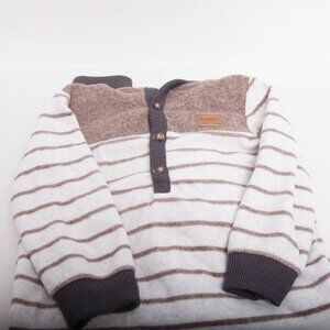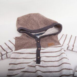 Cozy and adorable Carter’s baby boy hooded one-piece in size 18 months. Made from soft, plush velour in a heather white and brown striped pattern, this long-sleeve romper is perfect for cooler days and nights.