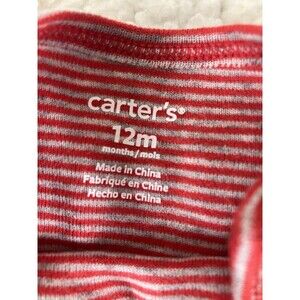 The product is a lot of four Carter's baby boy bodysuits in size 12 months. Each bodysuit features cute sayings and stripes, making them both stylish and comfortable for your little one. The colorful striped pattern adds a fun and playful touch to your baby's wardrobe. Perfect for a boy's department, these one-piece outfits are a great addition to any little boy's clothing collection.