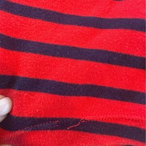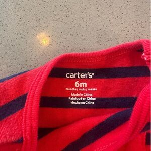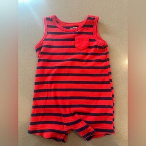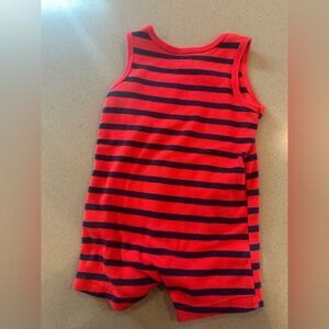 Carter's red and navy blue striped romper- size 6 months. sleeveless with buttons on the bottom for easy wear and diaper changes. Some lose threading on the bottom (refer to photo)