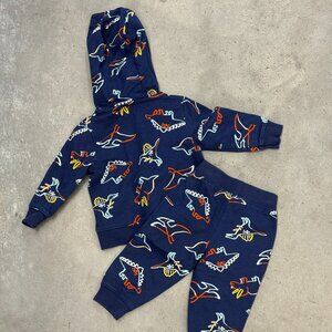 Carter’s baby boys two-piece set in size 9 months. Includes a navy zip-up hoodie and matching joggers with colorful dinosaur print. Both pieces are in like new condition with no visible signs of wear. Soft, comfortable, and perfect for everyday wear.