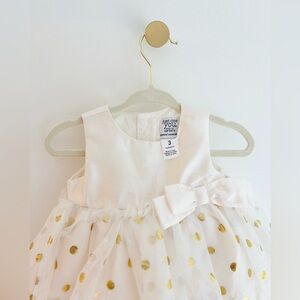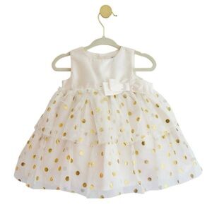 BEAUTIFUL elegant Carter’s Just One ivory dress with shimmering gold polka dots and layered tulle. Adorned with a stylish bow. Button down closure in back for easy on and off.