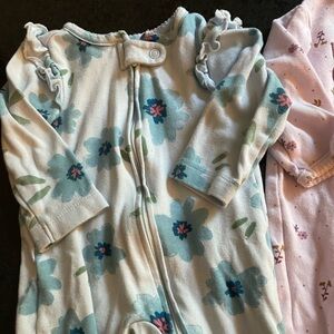 3 Footies -- one milk and cookies, one baby sister and one blue floral