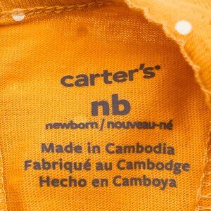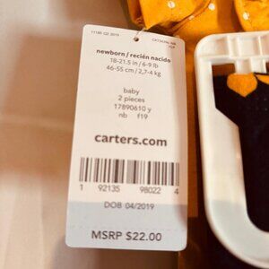 New with tags. Carter’s 2-piece outfit set for newborn baby girls. Includes a mustard yellow polka dot ruffle bodysuit with lace trim, paired with black floral leggings. Soft cotton fabric with snap bottom for easy diaper changes. Perfect for coming home outfit, photos, or gifting.