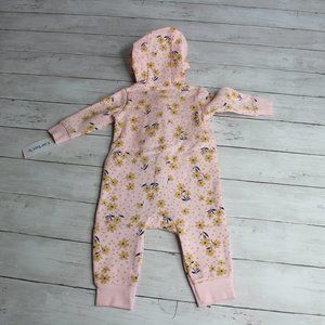 This long sleeve one piece coverall romper is made of a sweatshirt type material with fleece lining. It is pink with golden tan flowers with navy denim blue accents. It has a full front zipper, attached hood with ribbed cuffs. It is brand new with tags.