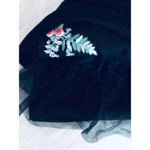 Darling velvety dress with embroidery. Fully lined; with a mesh underlay for added body. So sweet. Dress is 75% cotton, 25% polyester; embroidery is 100% polyester. Under-layer is 100% nylon while lining is 100% poly. Excellent, pre-owned condition.