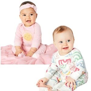 3-piece set includes: 2 jumpsuits & 1 headwrap Jumpsuits: long sleeves, ribbed trim. snaps at the legs for easy changes Includes matching headwrap