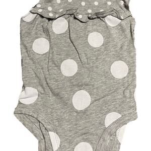 Gray bodysuit includes; all over white polka dots, ruffled design at chest and sleeves and 3 button snap closure at bottom