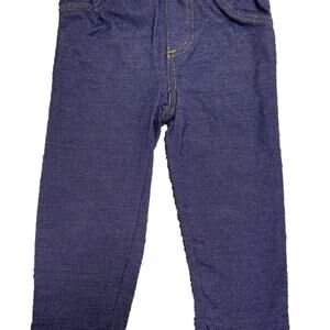 Blue knit denim pant includes; faux front closure, faux front pockets and elastic waistband