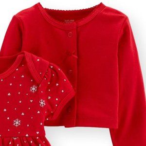 Brand new, Just One You by Carter's baby girls' red dress with diaper cover built in (snap bottom), with coordinating snap long sleeve cardigan. Dress has silver snowflakes with santa applique, and cardigan is solid red. Absolutely adorable and perfect for baby's first Christmas Holiday.