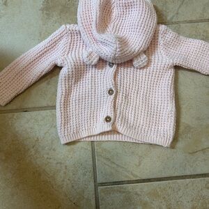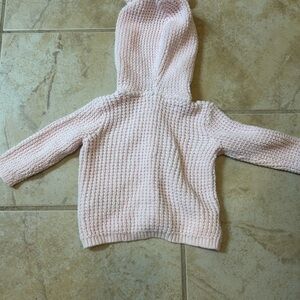 Charming pink knit sweater with cozy texture. Pink cardigan with tiny ears. Real buttons make for easy on and off.