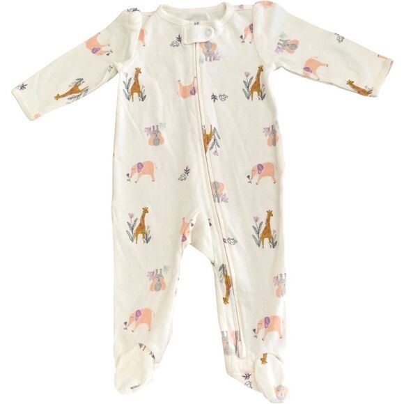Features a sweet pastel safari animal print (giraffes, elephants, birds) & soft fabric. Perfect for bedtime, lounging, daycare, or as an extra outfit in the diaper bag.