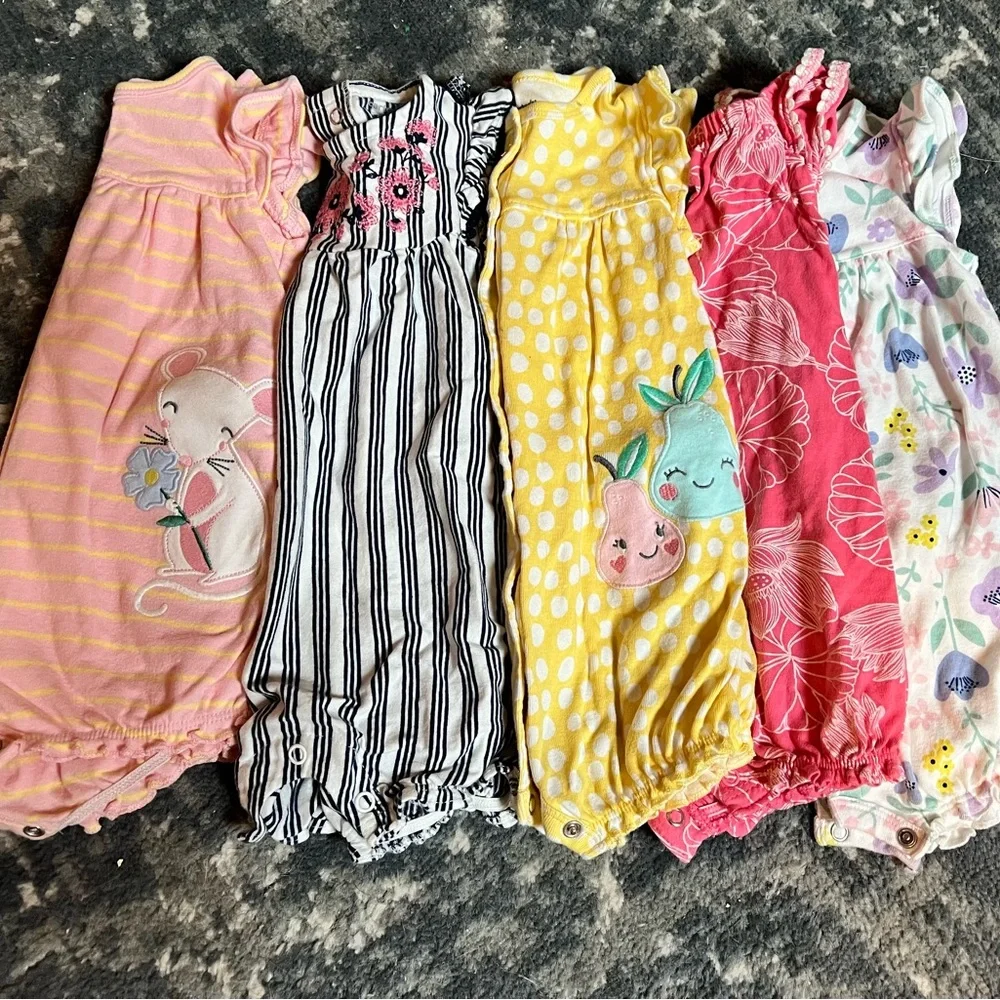 Adorable set of baby rompers from Carter’s. Features cute animal, floral and fruit designs. EUC