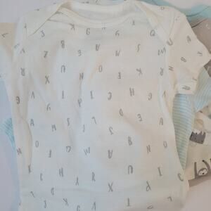Carter's Baby Set of 5 Onesies Alphabet and Animal Theme. Size 6 Months. Nickel-free snap closures and expandable shoulders to make changes a breeze. Onesies include screen printed "Happy Little One" slogan, allover animal print, and allover alphabet print. New with tags.