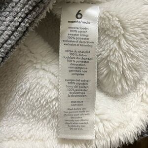 Sherpa-lined button-front cardigan, by Carter's. Features sweet 3D ears on the hood and includes two front pockets. Comes in gray and in a size 6 months — please see photos for measurements. This thick sweater could easily serve as a winter coat in warmer climates!