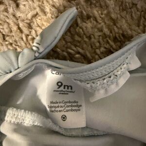Adorable blue swimsuit with ruffle details. Features playful nautical prints.